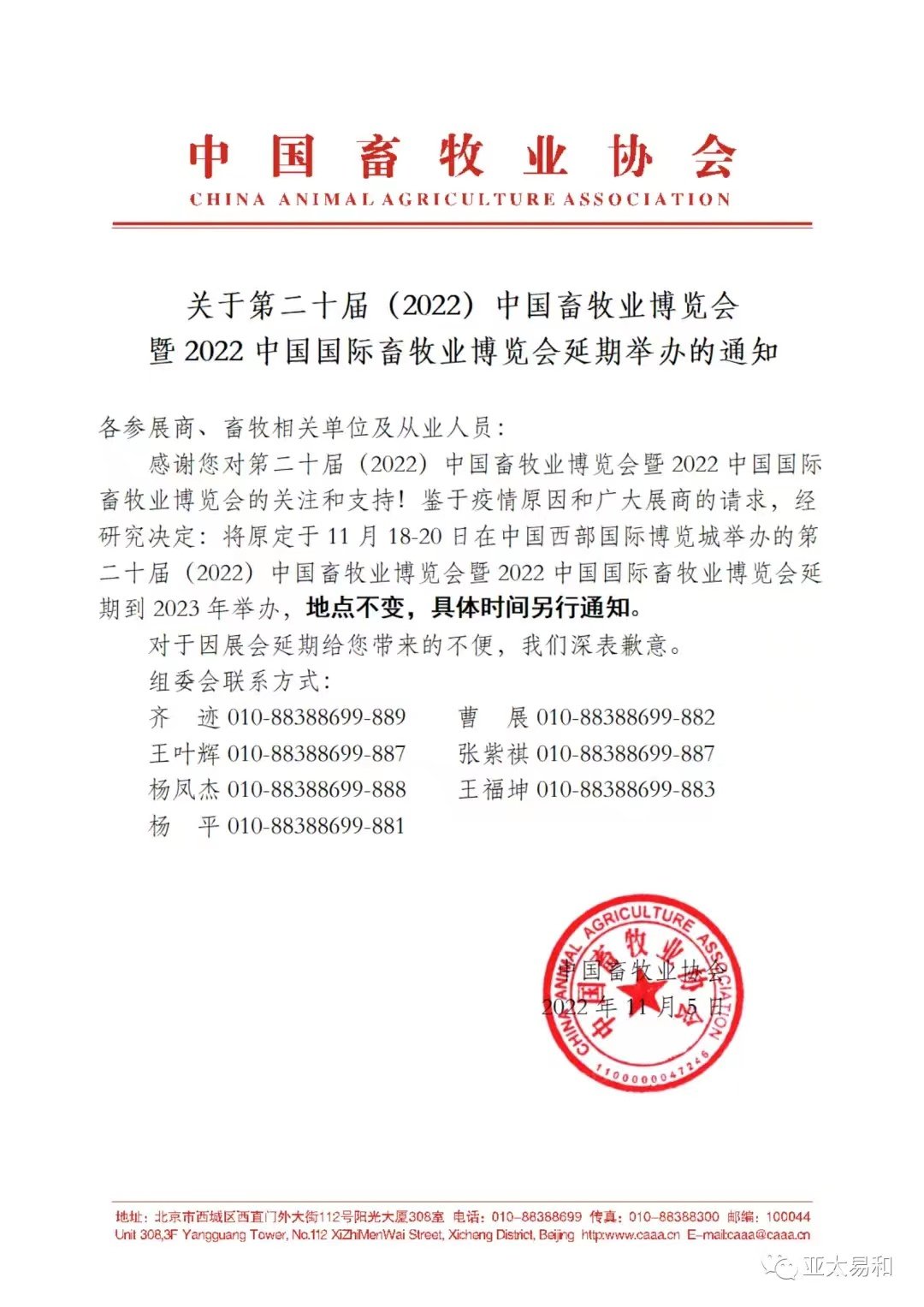 第二十屆(2022)中國(guó)畜牧業(yè)博覽會(huì)暨2022中國(guó)國(guó)際畜牧業(yè)博覽會(huì)延期到2023年舉辦